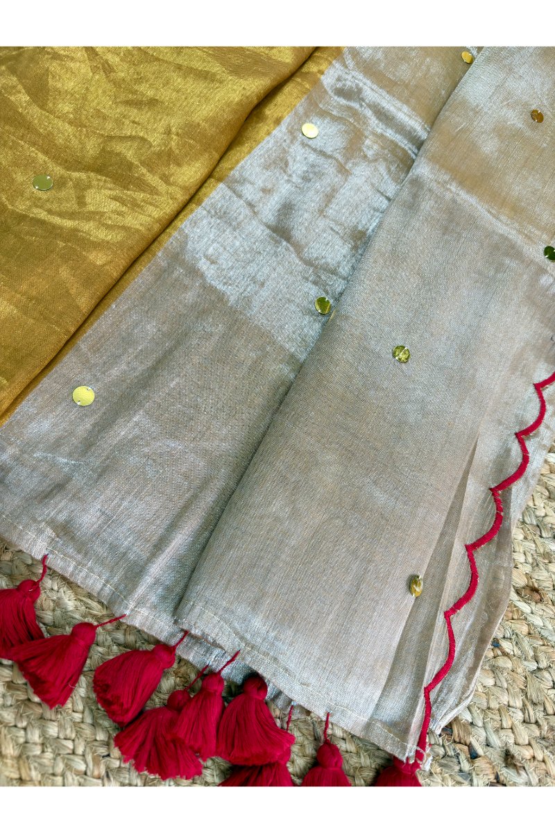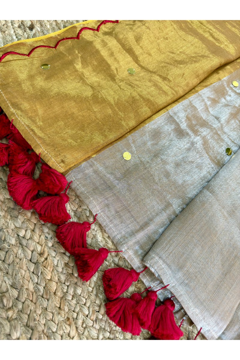 Half Golden & Half Silver Tissue Raga Saree with Ginni Work And Cutwork Border