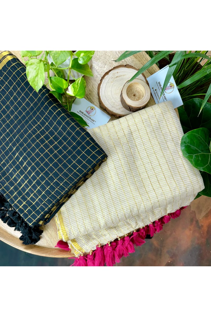 Plain color saree with golden zari woven checks with small jari border all over the saree ended with tassels on pallu.