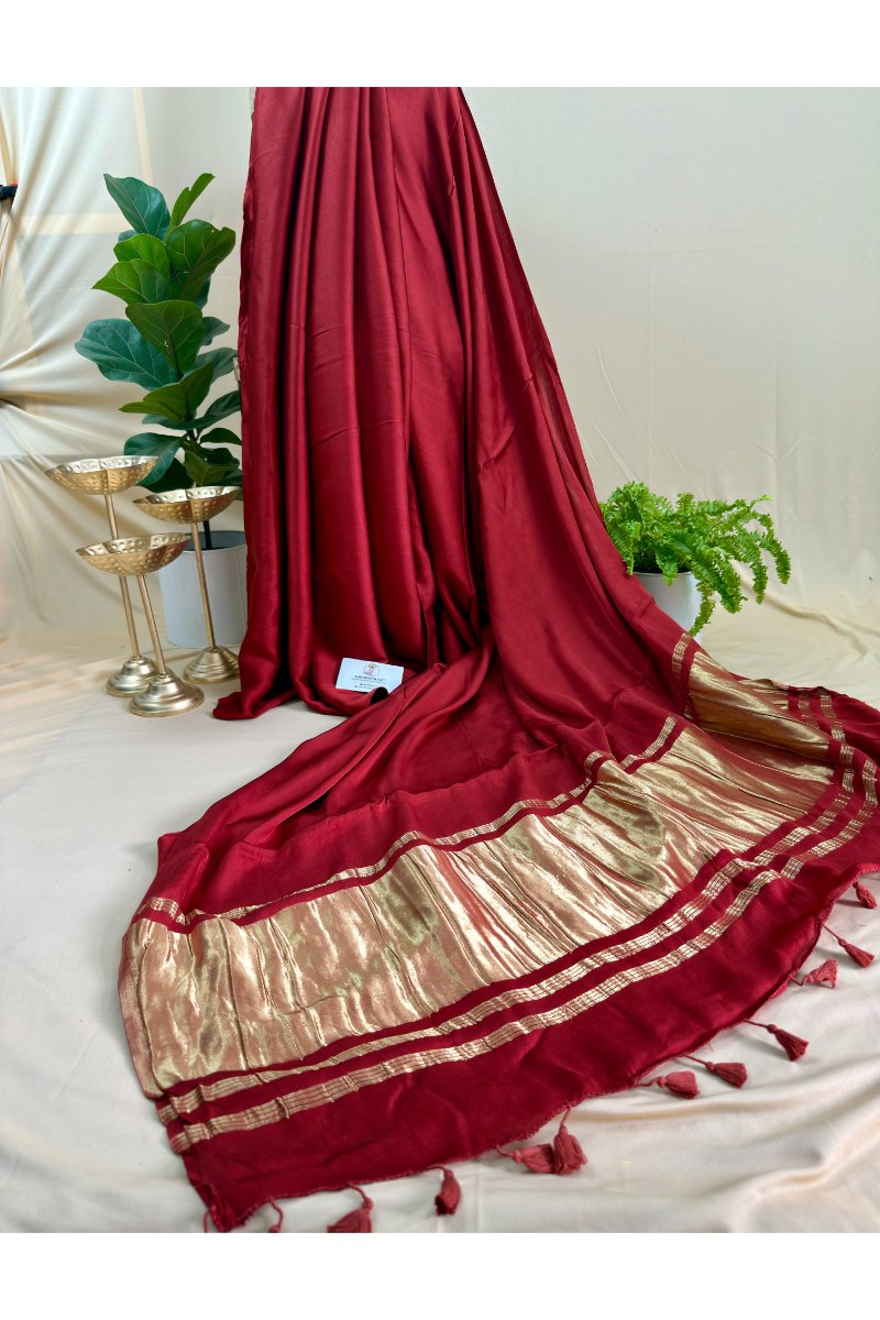 Elevate your ethnic wardrobe with this elegant Plain Modal Silk Saree, beautifully finished with a delicate tissue pallu. Crafted from pure modal silk, it drapes effortlessly with a soft sheen, while the tissue pallu adds a subtle luminous touch. Perfect for formal occasions or refined everyday wear festive wear,this timeless piece blends simplicity with sophistication.