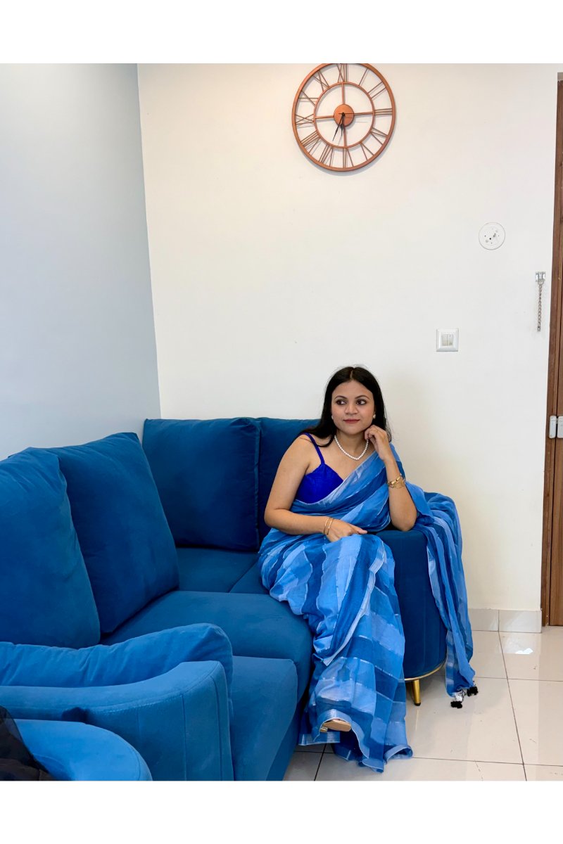 A vibrant blend of rainbow hues adorned with shimmering golden zari stripes running gracefully all over the saree, beautifully finished with handmade tassels at the pallu for an elegant handcrafted touch. Fabric: Pure Mul Mul Cotton (120 Count)