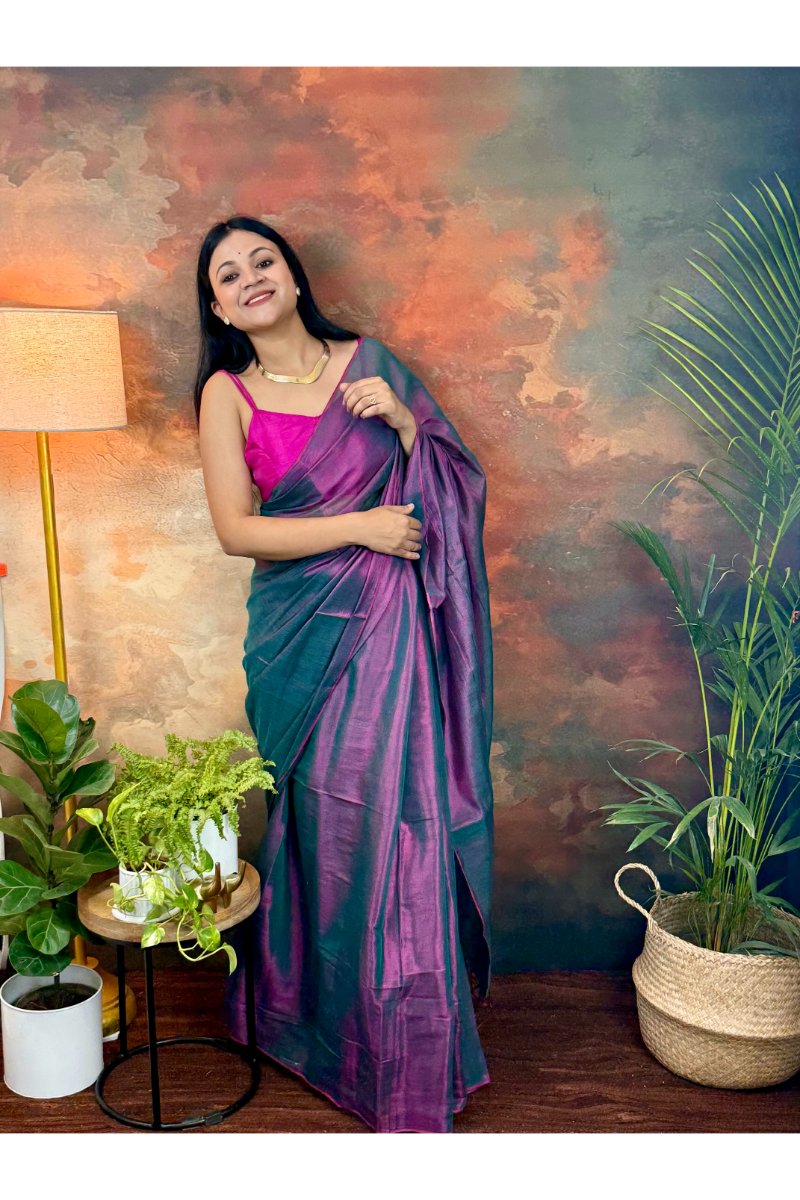 Make a chic statement with this Plain Tissue Raga Saree, featuring a stunning dual-tone effect that shifts beautifully with every movement. The soft Tissue Cotton fabric adds a subtle sheen, giving you an effortlessly festive and party-ready look without heavy embellishments.