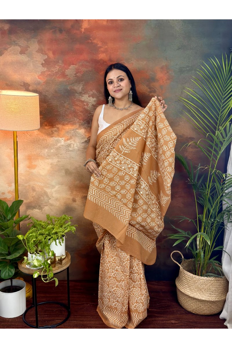 Made from breathable, lightweight cotton, this saree is soft on the skin and perfect for all-day comfort, especially during warmer seasons. The intricate handblock patterns add a touch of heritage elegance while keeping the look minimal and refined.