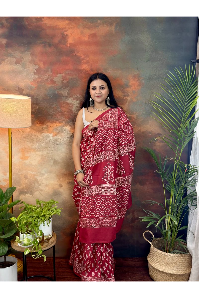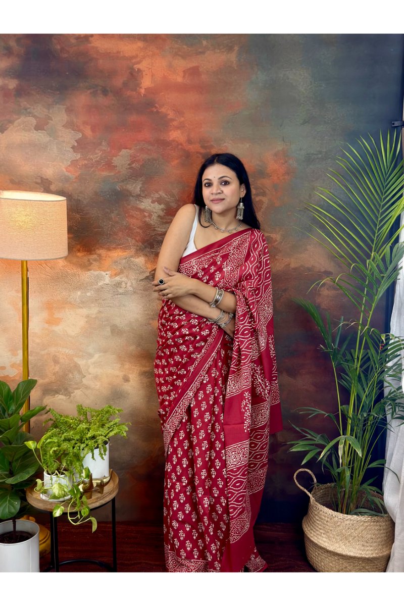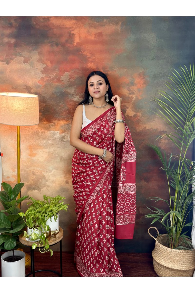 Made from breathable, lightweight cotton, this saree is soft on the skin and perfect for all-day comfort, especially during warmer seasons. The intricate handblock patterns add a touch of heritage elegance while keeping the look minimal and refined.