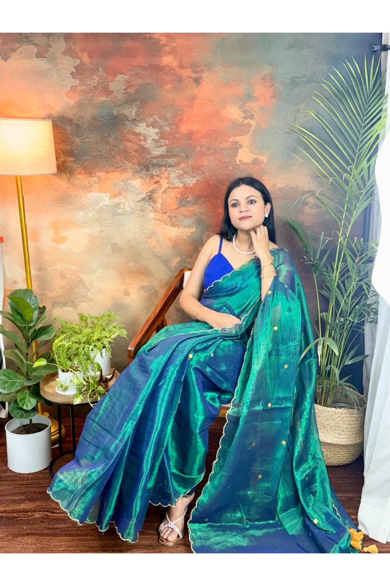 Crafted from soft cotton Tissue Fabric with a gentle sheen, it drapes beautifully and creates a chic, party-ready look without being overpowering. Perfect for wedding functions, festive celebrations, parties, and special gatherings, this saree blends minimalism with statement craftsmanship.