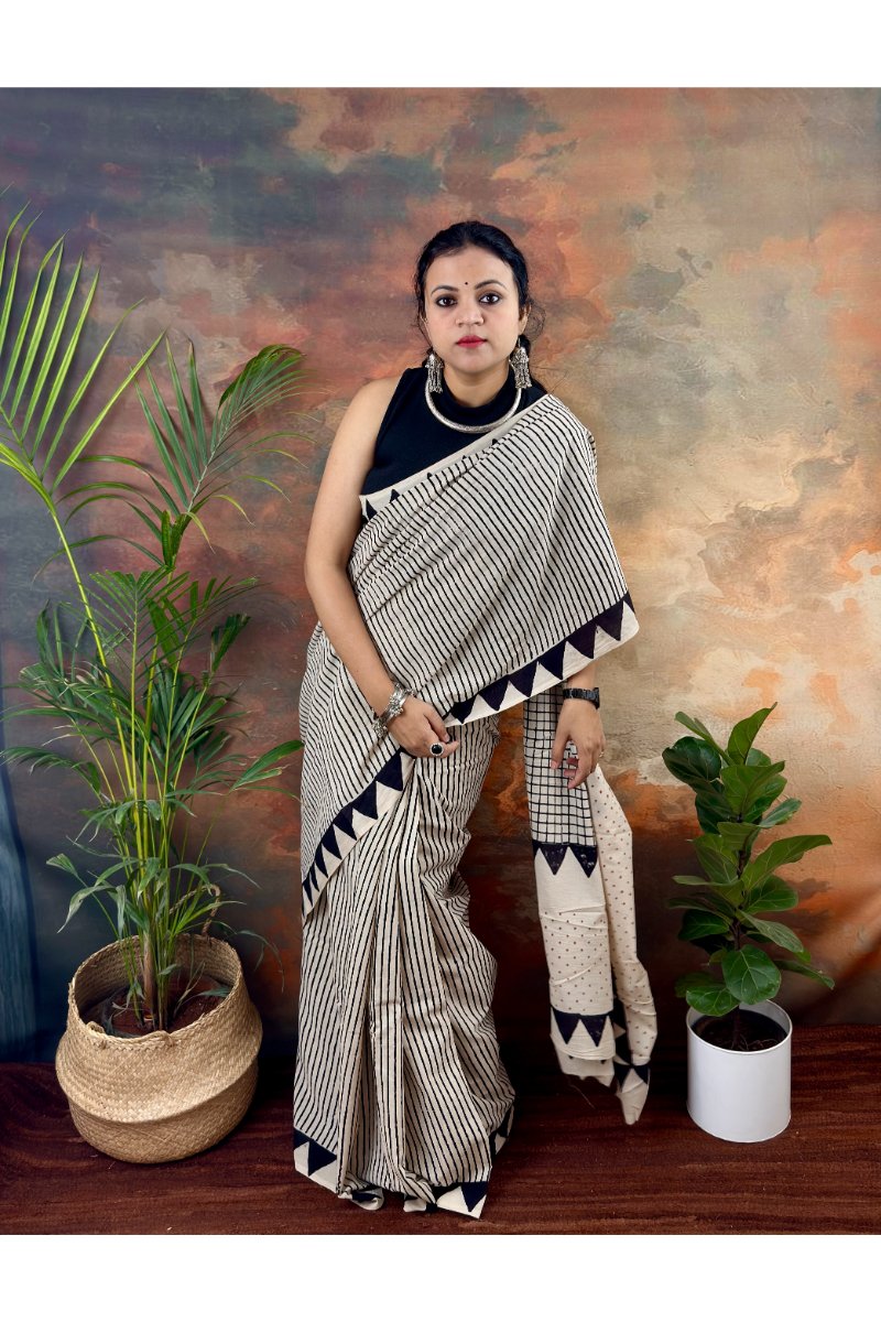 Zebra Stripe Bagru Handblock Pure Cotton Saree